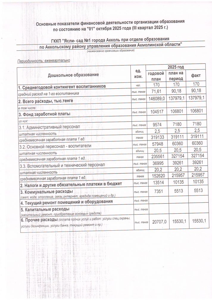 2025 жылғы "01" қазандағы жағдай бойынша білім беру ұйымының қаржылық қызметінің негізгі көрсеткіштері (2025 жылғы III тоқсан үшін )